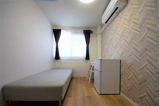 個人房間寬敞的窗戶,整面式的牆壁壁貼。依照不同房間壁紙也有不同的景致。房間內也附設衣櫥。門鎖採用用電子鎖,關於安全不用多慮。想要一個人的時候也能在房間裡安靜度過。全棟樓1、2樓是男女共用,3樓採女生專用的空間。