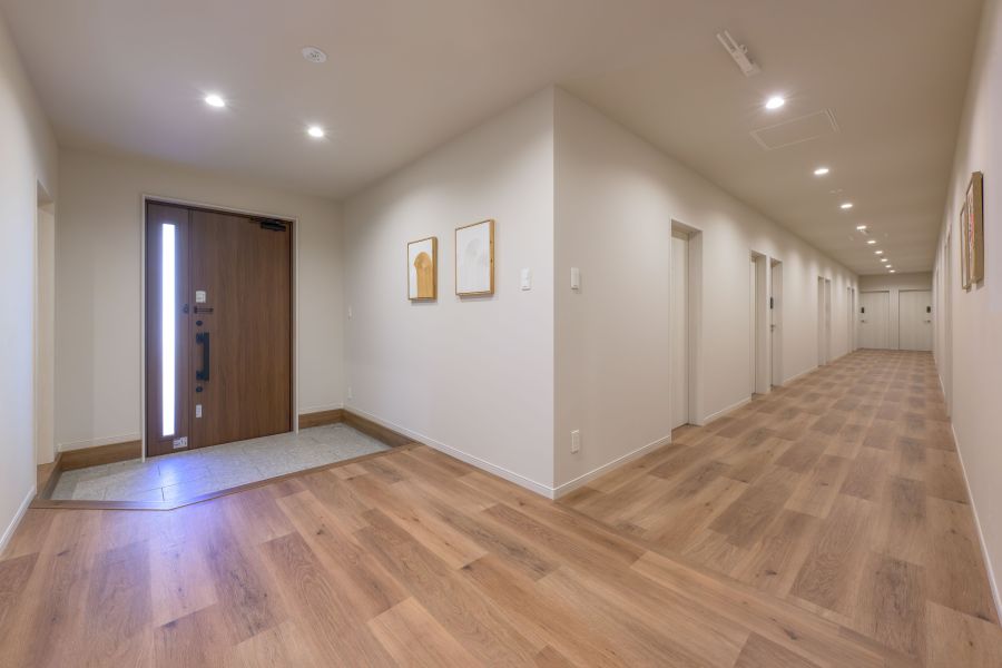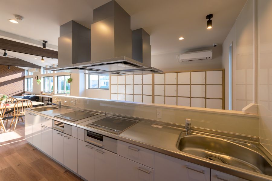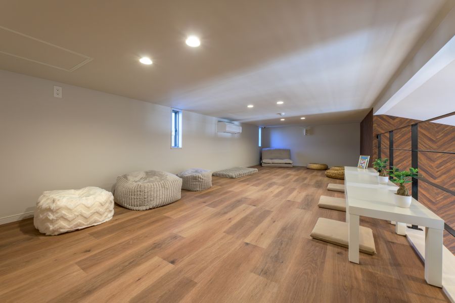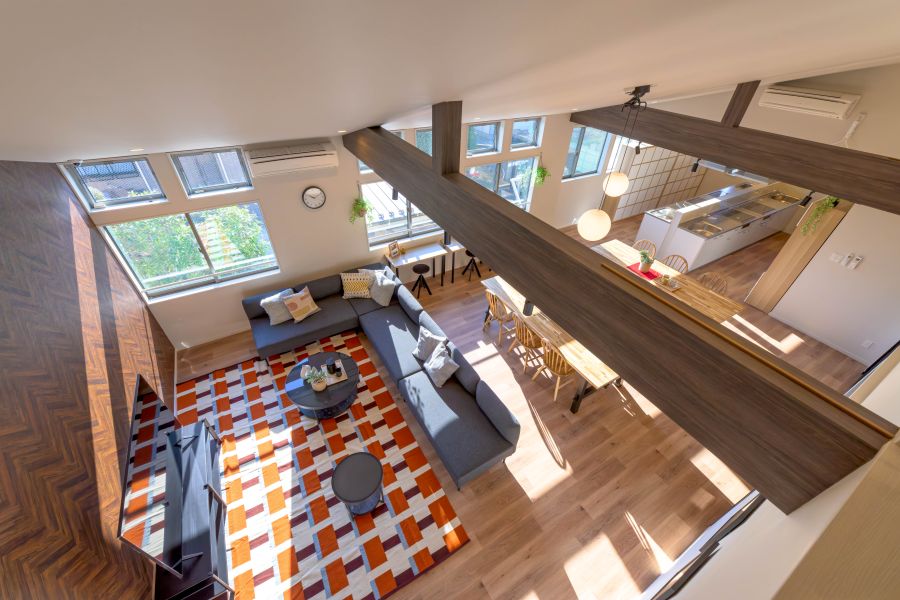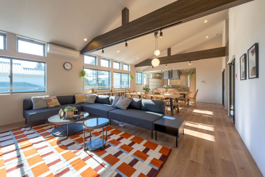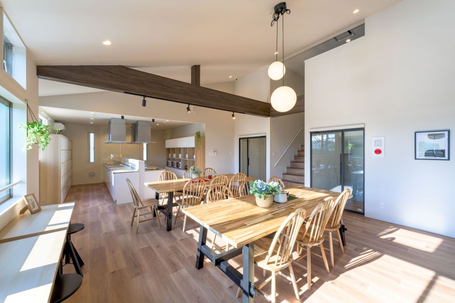 南向きの明るいLDKは広々42畳。天井も高く開放的な空間です。10人が座れる大型ソファに、大画面テレビ、2つのダイニングテーブルなどお気に入りの場所ですごしていただけます。4台のキッチンでみんなで楽しく調理も。テレワークルームもあります。