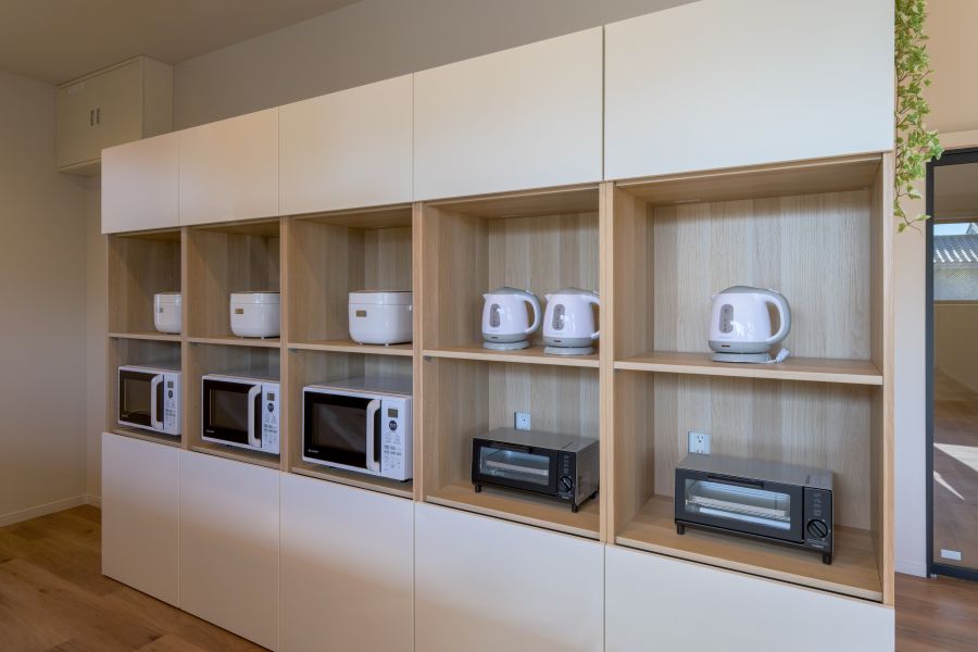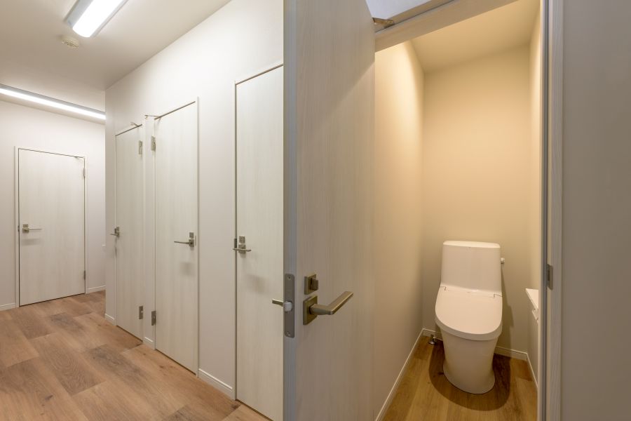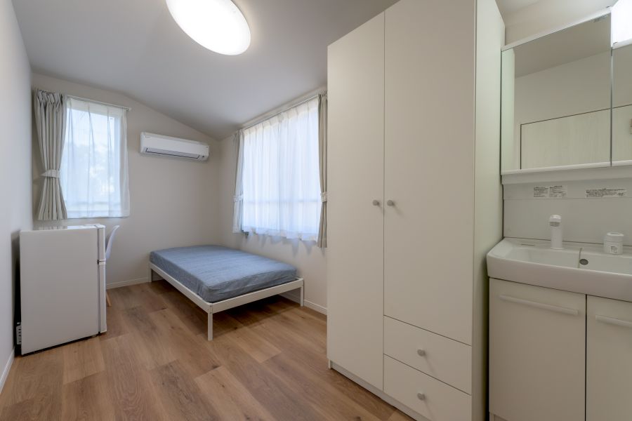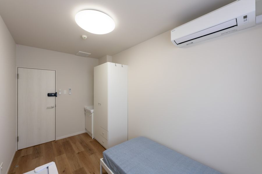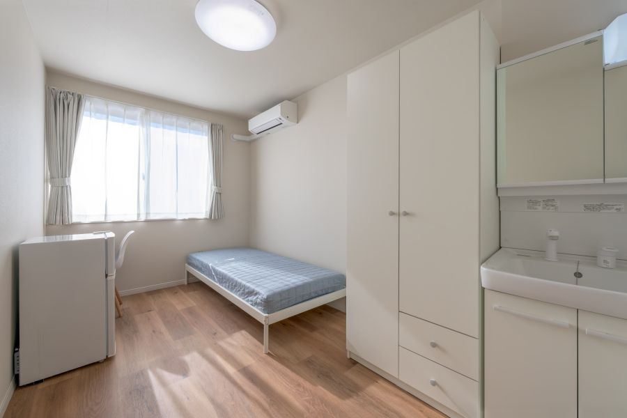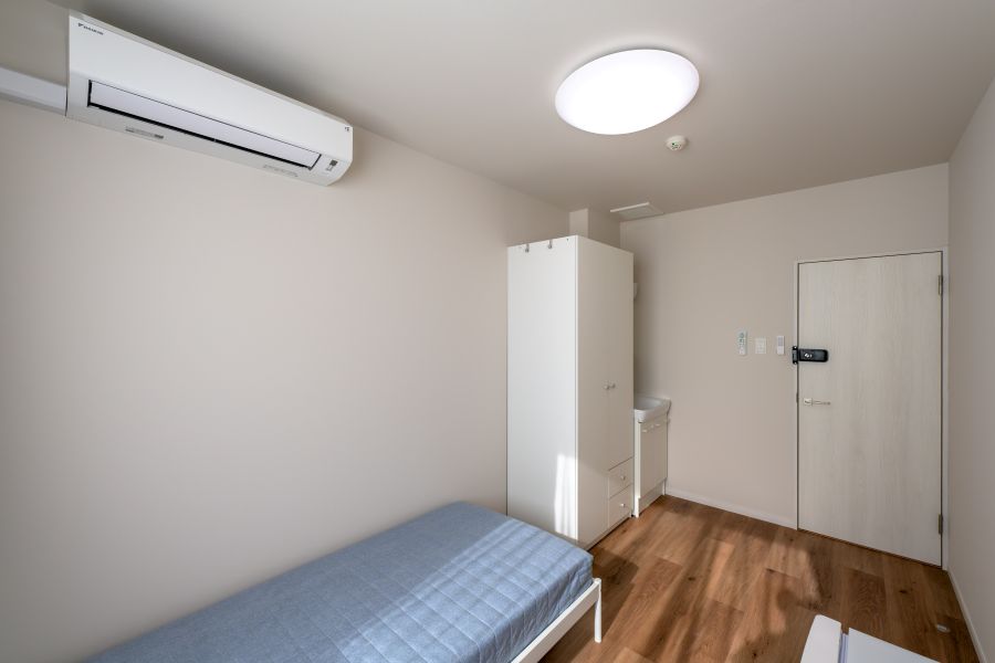 全室個室に洗面化粧台付き。収納も引き出し付きのクローゼットが付いています。2ドア冷蔵庫やベット・デスクも設置。デジタルオートロックでセキュリティーにも配慮。鍵を持ち歩く必要もありません。ひとりで静かに過ごしたいときには個室でまったりお寛ぎください。女性専用フロアもあります。