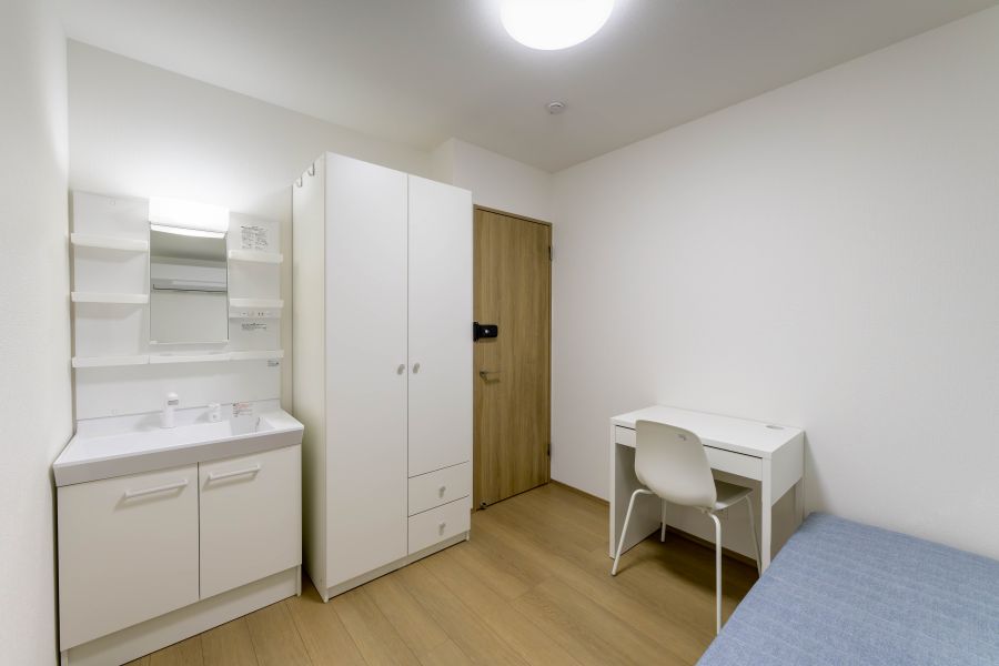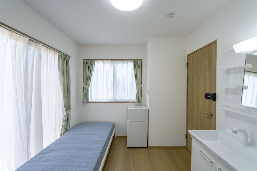 新築でオープンするシェアハウスには、個室に女性にはうれしい洗面化粧台を設置。朝の忙しい時間帯でもハウスメイトの心配をすることなく、ゆっくりご準備いただけます。冷蔵庫やベット、クローゼットも設置済。個室の鍵も暗証番号式のデジタルオートロック。鍵を持ち歩く必要がないため失くしてしまう心配もなし。ひとりで静かに過ごしたいときには個室でまったりお寛ぎください。