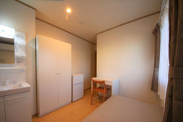 ¥30,000- | 洋室、日当り良好。 ベッド、洗面台、冷蔵庫、 クローゼット、机、椅子、 エアコン、カーテン付。 |