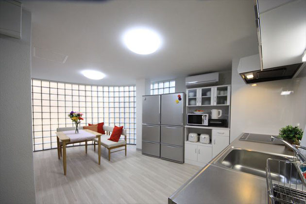 개인실은 밝고 트인 방을 중심으로 4.3장의 방에서 7.7장의 방까지 선택이 많습니다. 짐의 양과 예산에 맞게 방을 고를 수 있습니다. 리빙 다이닝은 곡선을 그리고 유리 블록이 인상적이다.