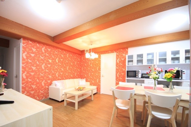 リビングダイニングは、オレンジの壁紙がアクセント。みなさんでゆっくりとくつろいでいただける、ソファの上には、かわいいシャンデリアも。
