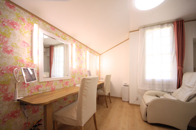 一番の自慢は、6畳のスペースを確保したビューティールーム「Be-Lounge」。パナソニックのビューティー家電を結集したセルフエステ空間。洗面ボールやマッサージチェアも配し、女子力アップ間違いなしの充実空間です。専用アプリを導入したiPadを使用し、取扱い説明や製品情報・使い方の動画などが簡単に閲覧でき、快適かつ効果的に美容家電が使用できる空間となっております。6畳以上確保された各個室は、明るい南向き中心。天井まである大きなクロ-ゼットと、壁一面に施されたアクセントクロスが印象的です。