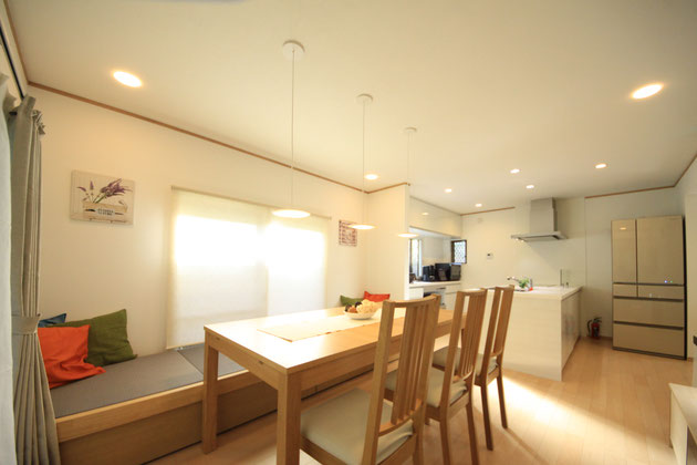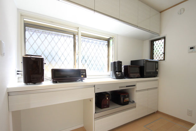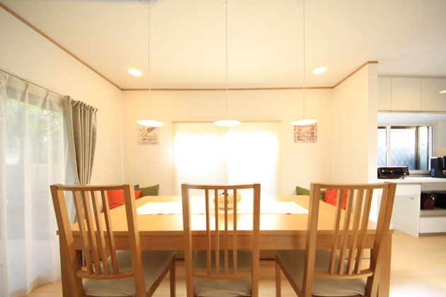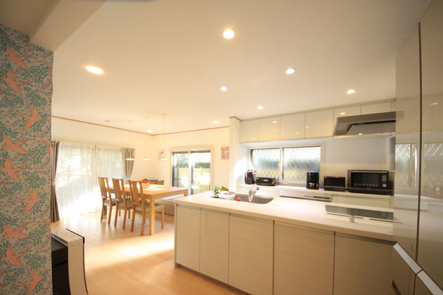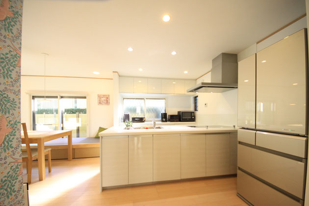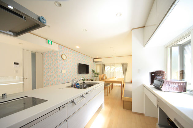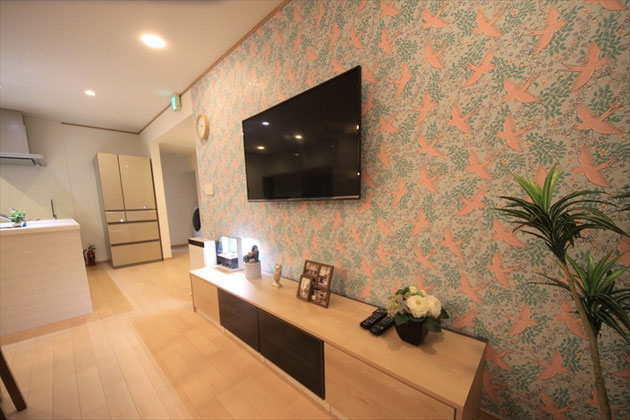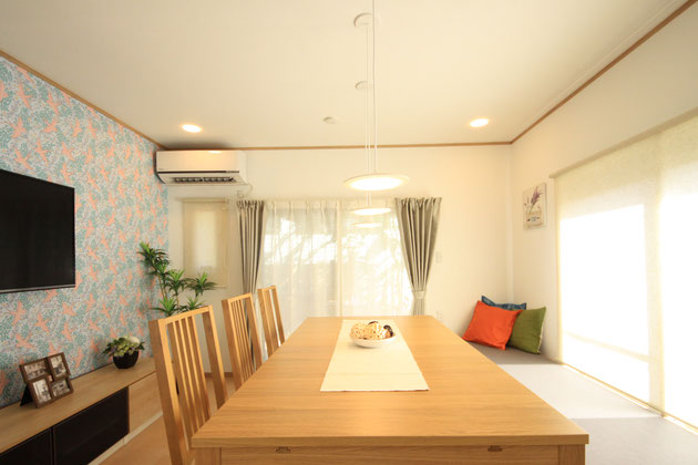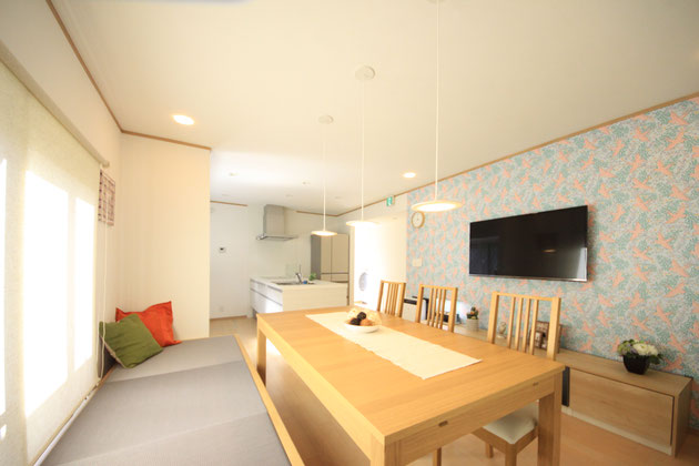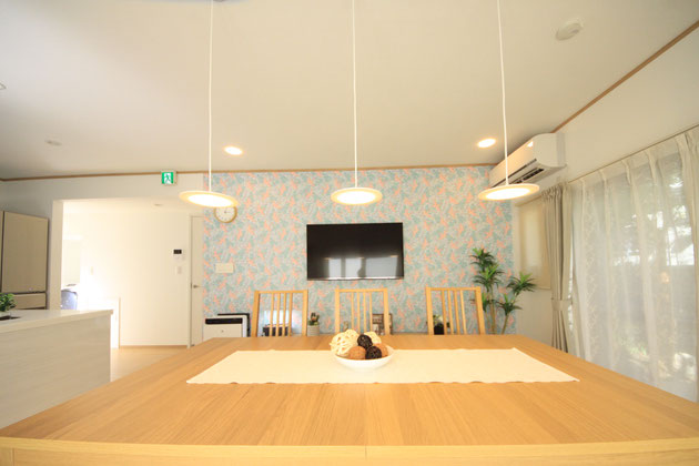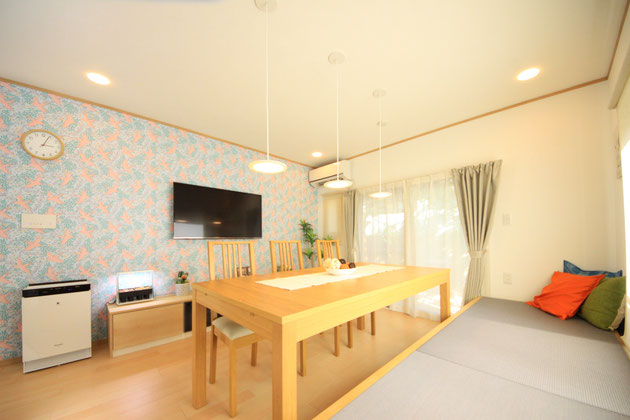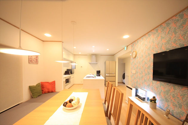 玄関を入ると、フルリフォームされたまるで新築のような空間が。さらにリビングに足を踏み入れると、まず目に飛び込んでくるのが大きなオープンキッチンと充実の調理家電群。料理好きにはたまらないキッチンです。ダイニングテーブルは、半分がチェアでもう半分は掘りごたつをイメージした畳風のソファチェア。大型テレビが掛けられた壁面は、明るくおしゃれなアクセントクロス。